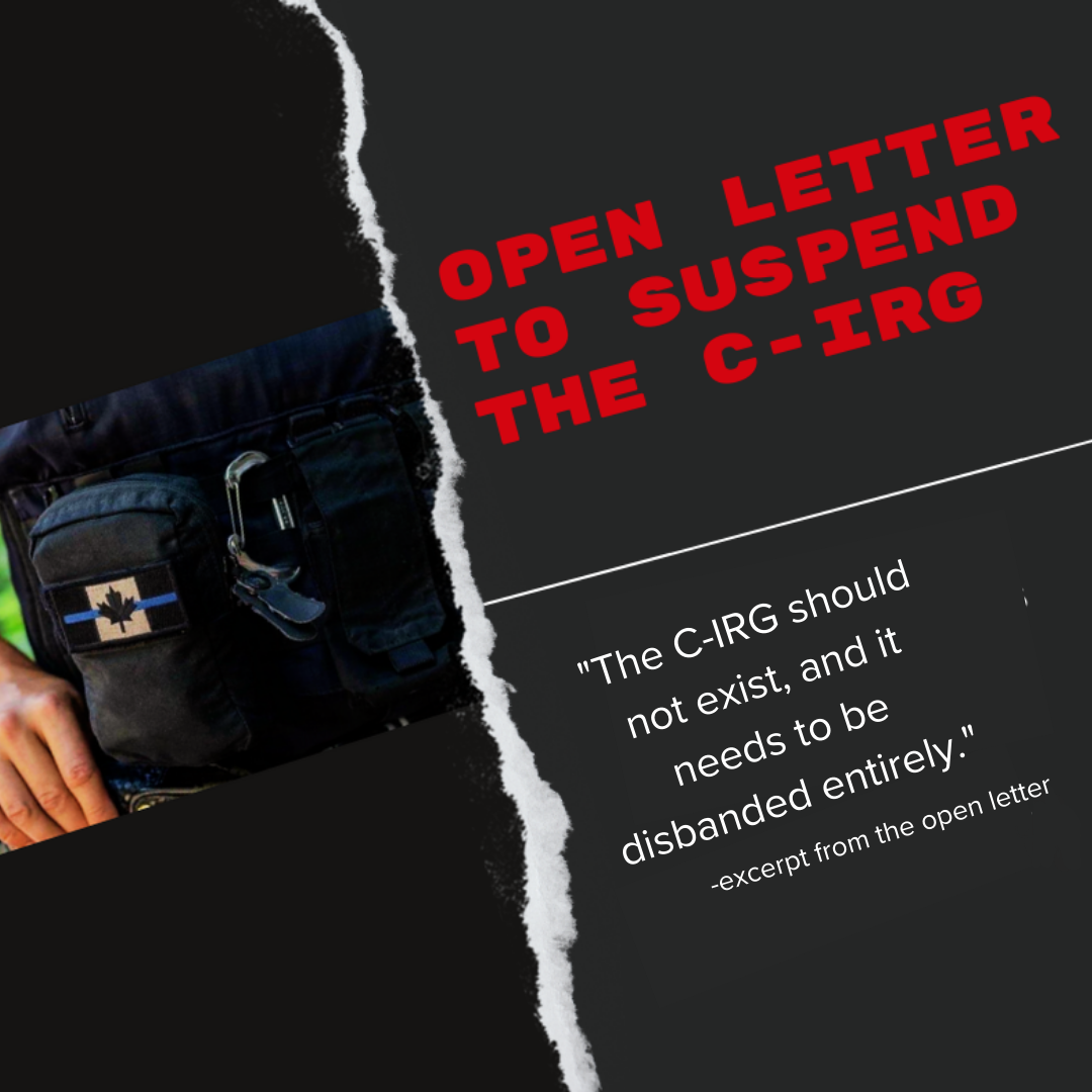 Given the serious nature of allegations against the C-IRG, we are calling on Canada, BC and the RCMP E-division command to suspend all C-IRG duties and deployment. This a collective response the the massive number of incidents of violence, assault and racism of this unlawful police unit. It is a call for the immediate abolition of this force. Read the full letter here
