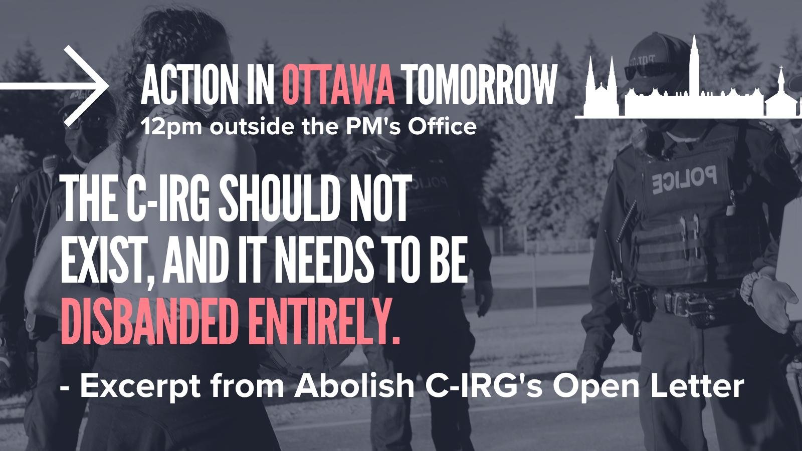 Join a gathering on Algonquin territory (Ottawa) on Wednesday April 19th at noon outside the PM’s office, organized by Peace Brigades international. to help amplify the open letter created by the Abolish CIRG Coalition